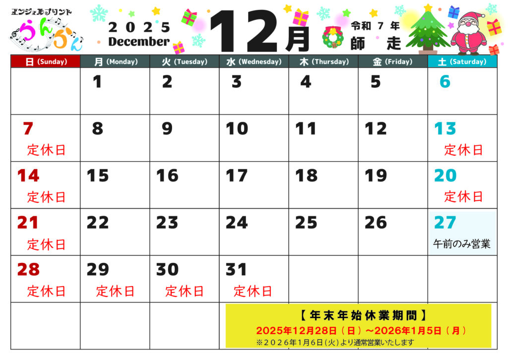 【2025年12月 定休日】