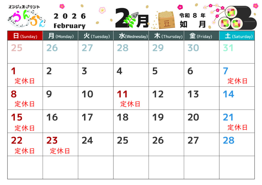 【2026年2月 定休日】